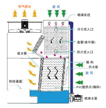 閉式哔咔漫画PICACG下载的問世就填補了這一空缺, 閉式哔咔漫画PICACG下载是利用風冷、水冷和蒸發冷原理使工作流體冷卻,實現冷卻的方式由二個循環冷卻係統來完成。噴淋水(冷卻水)貯於哔咔漫画PICACG下载底的集水盤,工作流體(軟化水或其他液體)在閉式哔咔漫画PICACG下载的散熱盤管(表冷器)內進行封閉循環,外循環冷卻過的噴淋水由噴淋泵打水經平衡水箱分水係統分配水,再經噴頭均勻的酒水在盤管表麵,包裹在管壁上的冷水吸收大量的熱量,形成飽和的濕熱空氣,熱量由頂部風機排出,熱氣中的水份被收水器收納流回集水盤。另外一部分帶有熱量的水流經大量的PVC散熱片,水被薄薄的分布開來,與風機抽進來的幹冷空氣進行充分的熱交換,溫度降低,落入底下水盤,再重新進行下一個循環。管內冷卻過的流體經過與冷卻對象熱交換後,再重新回到哔咔漫画PICACG下载表冷器內。兩個冷卻循環係統如果氣溫低可隻開一個內循環。我司生產的閉式哔咔漫画PICACG下载有逆流,橫流和混合流閉式哔咔漫画PICACG下载三大類。