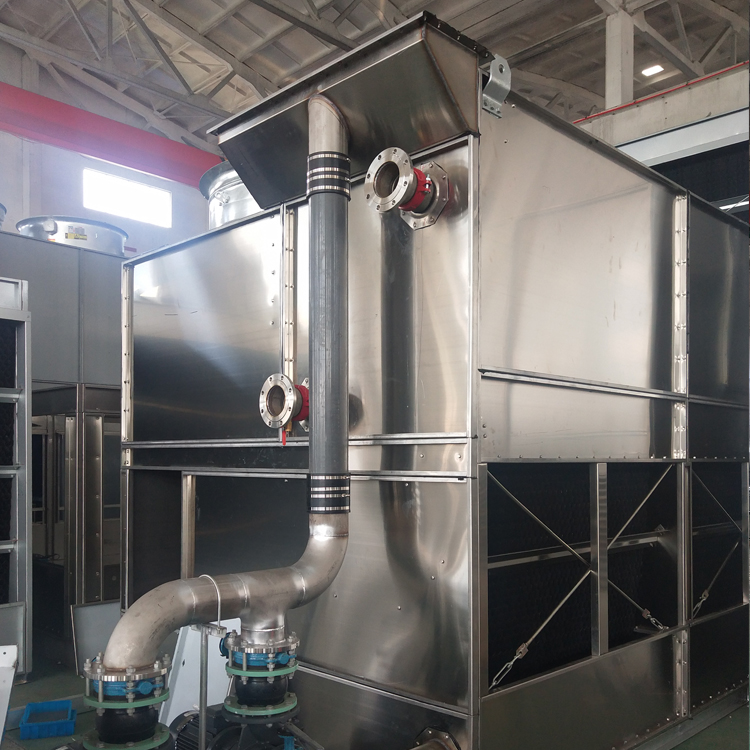 閉式哔咔漫画PICACG下载的問世就填補了這一空缺, 閉式哔咔漫画PICACG下载是利用風冷、水冷和蒸發冷原理使工作流體冷卻,實現冷卻的方式由二個循環冷卻係統來完成。噴淋水(冷卻水)貯於哔咔漫画PICACG下载底的集水盤,工作流體(軟化水或其他液體)在閉式哔咔漫画PICACG下载的散熱盤管(表冷器)內進行封閉循環,外循環冷卻過的噴淋水由噴淋泵打水經平衡水箱分水係統分配水,再經噴頭均勻的酒水在盤管表麵,包裹在管壁上的冷水吸收大量的熱量,形成飽和的濕熱空氣,熱量由頂部風機排出,熱氣中的水份被收水器收納流回集水盤。另外一部分帶有熱量的水流經大量的PVC散熱片,水被薄薄的分布開來,與風機抽進來的幹冷空氣進行充分的熱交換,溫度降低,落入底下水盤,再重新進行下一個循環。管內冷卻過的流體經過與冷卻對象熱交換後,再重新回到哔咔漫画PICACG下载表冷器內。兩個冷卻循環係統如果氣溫低可隻開一個內循環。我司生產的閉式哔咔漫画PICACG下载有逆流,橫流和混合流閉式哔咔漫画PICACG下载三大類。