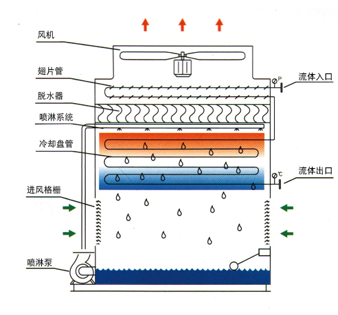 換熱機理先進,將水蒸發與空氣冷卻,傳熱與傳質過程融為一體;利用空氣冷卻的翅片預冷段和水膜減壓蒸發段相結合,強化換熱遇冷後流體進入蒸發溫度低,不易結垢,將空冷的通風機和蒸發的引風機合二為一;能效比高,節水節電,運行費用低,性能優異,能達到更高工藝參數要求,投資效益高。